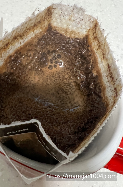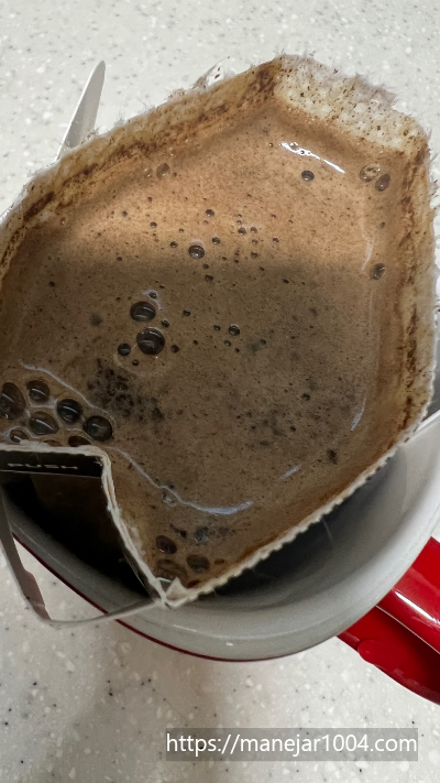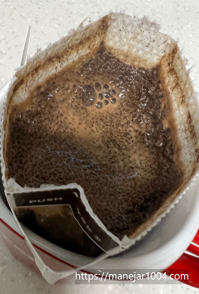 6. 물이 원두가루를 통과하면서 커피가 내려집니다. 드립백 안에 물이 떨어지면서, 원두가루가 보이면 또 2차 물을 붓고, 3차까지 물을 부어줍니다.
