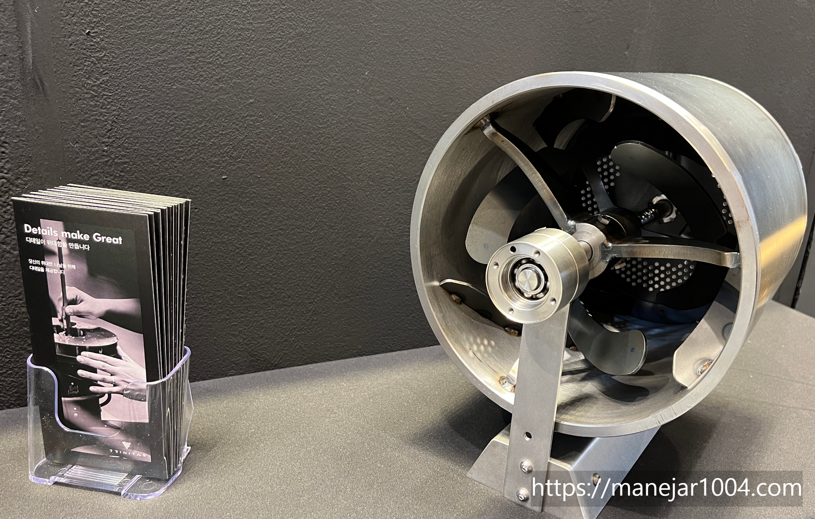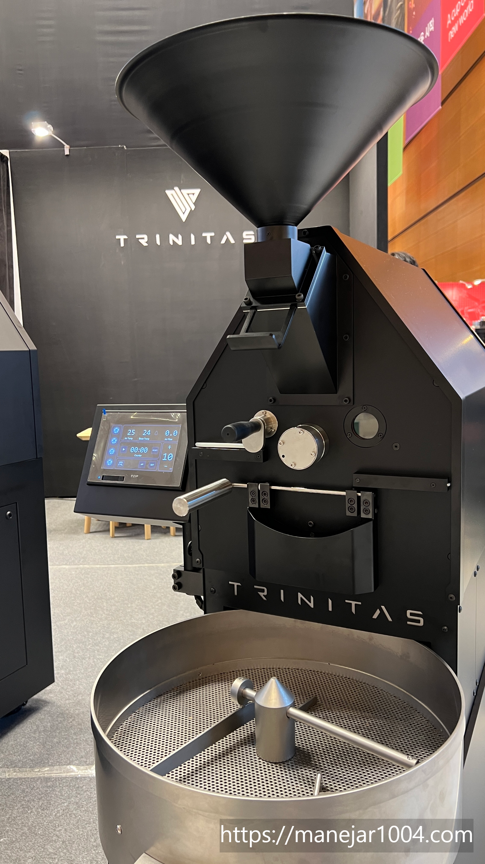 블랙톤의 매트한 외관이 눈에 띈 로스팅기기 부스에서 설명을 들었습니다.