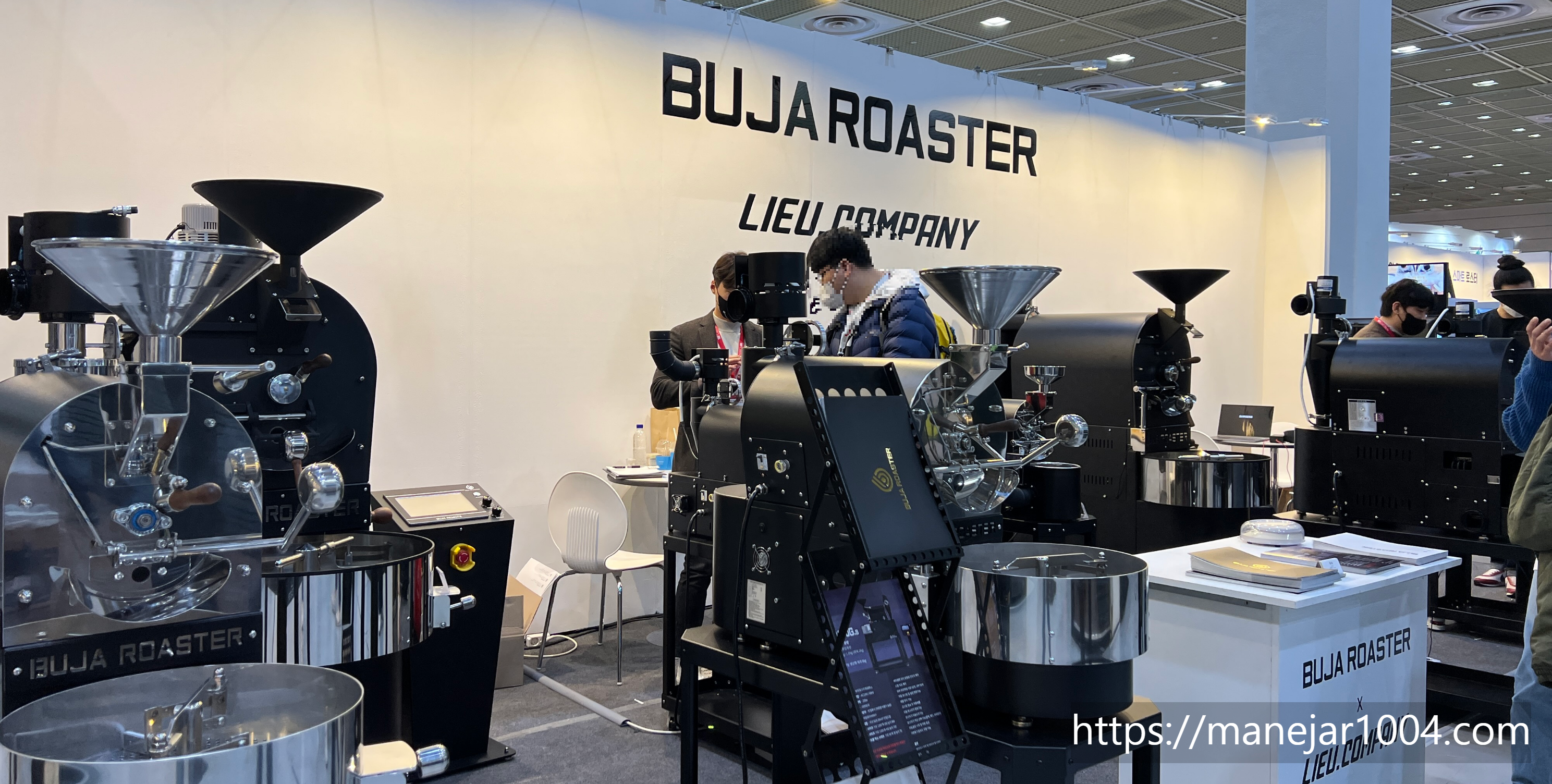 블랙톤의 매트한 외관이 눈에 띈 로스팅기기 부스에서 설명을 들었습니다.