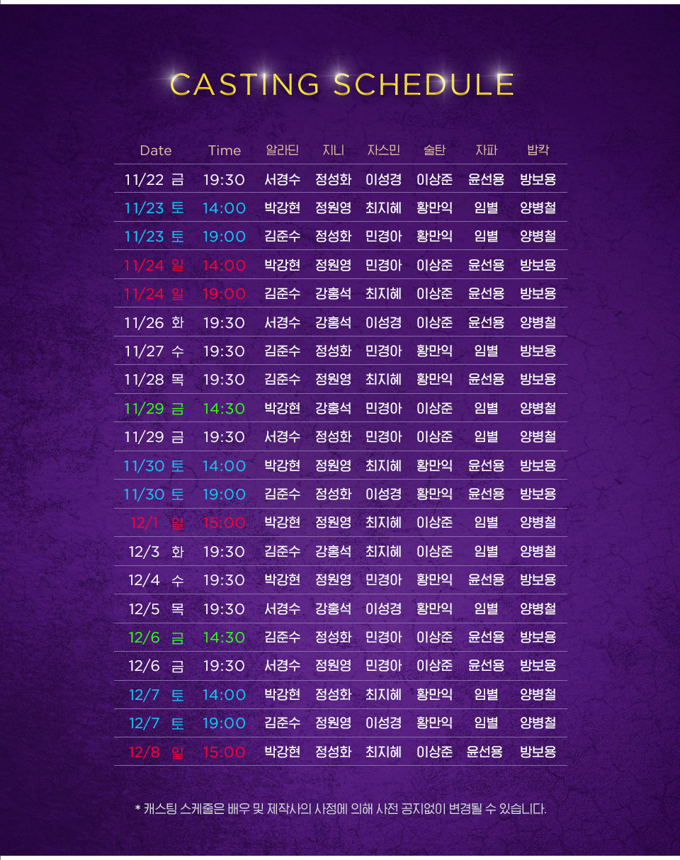 • 화,수,목 오후7시 30분 / 금 오후 2시 30분, 7시 30분 / 토 오후 2시, 7시 / 일 오후 3시 ( 월 공연없어요.)