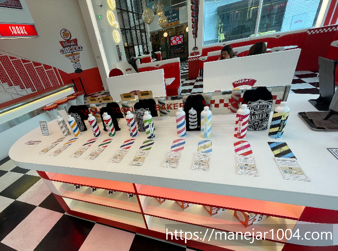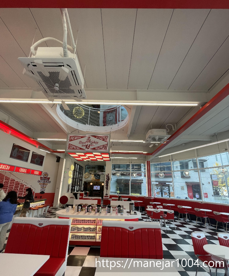 이 카페는 인테리어가 화이트와 레드로 강렬하면서 산뜻한 느낌이 들어요. 카페입구부터 약간 미국느낌이랄까? 고속도로 신나게 달리다가 있는 미국식 휴게소같은 느낌도 들고, 하이틴 미드에 나올 것 같은 느낌이 한가득 담겨있어요.