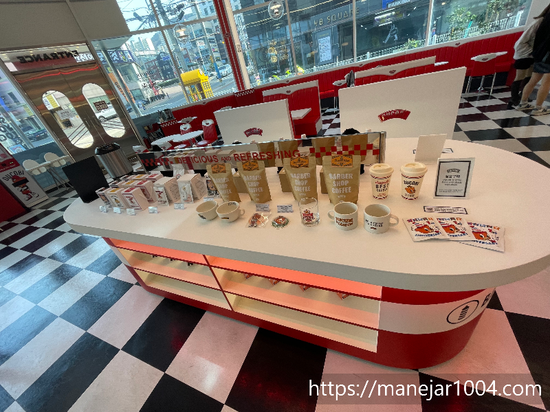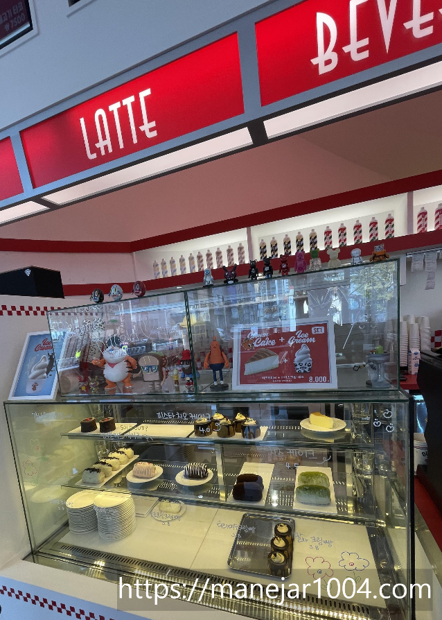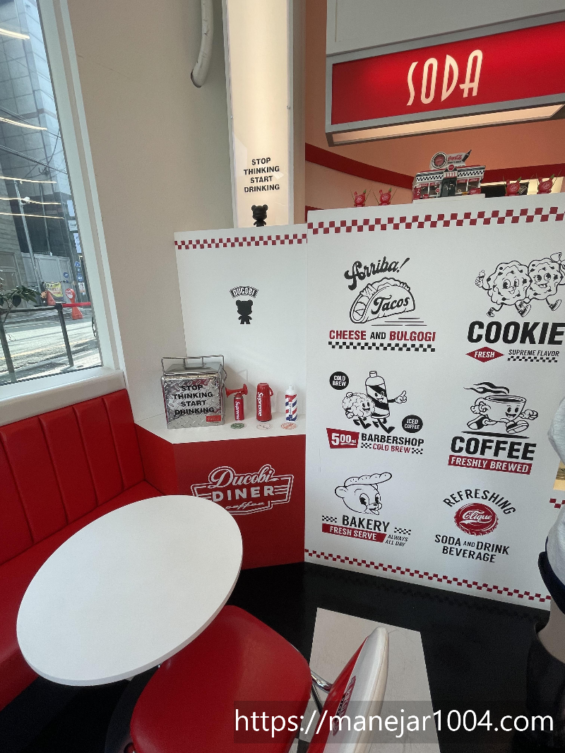 이 카페는 인테리어가 화이트와 레드로 강렬하면서 산뜻한 느낌이 들어요. 카페입구부터 약간 미국느낌이랄까? 고속도로 신나게 달리다가 있는 미국식 휴게소같은 느낌도 들고, 하이틴 미드에 나올 것 같은 느낌이 한가득 담겨있어요.