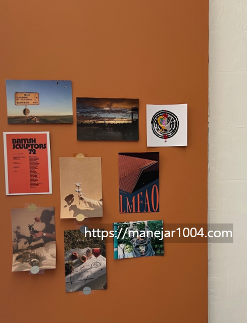 벽면에 포스터 및 엽서, 그림들 무심히 붙인 느낌도 좋네요