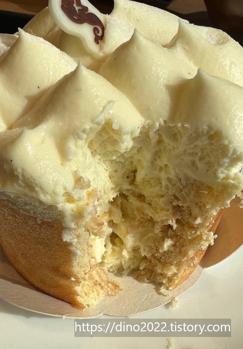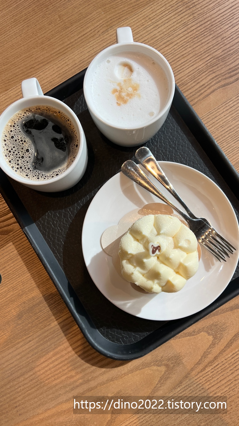 실제로 이 케이크를 먹으면서 한쪽을 잘라서 먹어보니 안쪽에서 크림이 들어가있고 , 크레이프 케이크같은 느낌처럼 겹겹이 되어있습니다. 자극적이지 않는 케이크 맛에 부드럽게 아메리카노와 잘 먹었습니다.