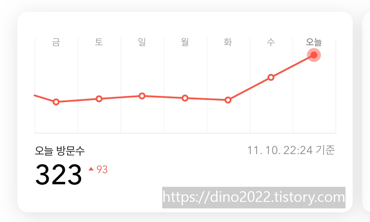 나락으로 떨어졌던 방문자수가 점점 살아나는 느낌이 듭니다. 이 방문자수는 제 또 다른 티스토리인데 오늘 자정기준 방문자수 339명으로 마무리했습니다.  시간으로는 어제, 카뷰와 티스토리, 네이버 블로그까지 예상보다 만족스러운 방문자수에 짜릿한 기분이 느껴졌어요.