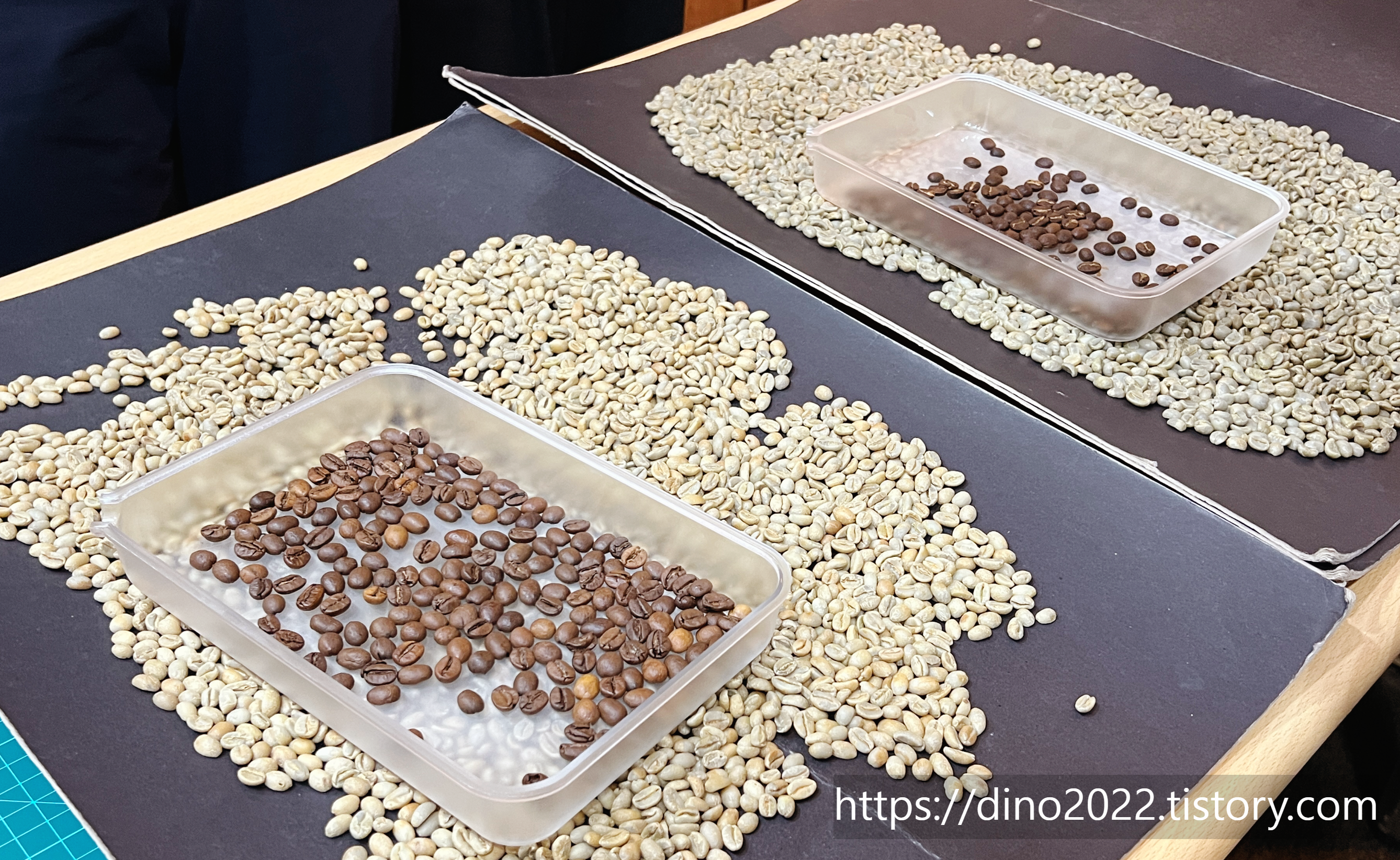 손상된 결점두를 골라내는 건, 맛이나 향에 좋지 않은 영향을 주기 때문에 로스팅 전에 검은색 보드나 어두운 칼라매트 위에 생두를 깔고 골라냅니다.