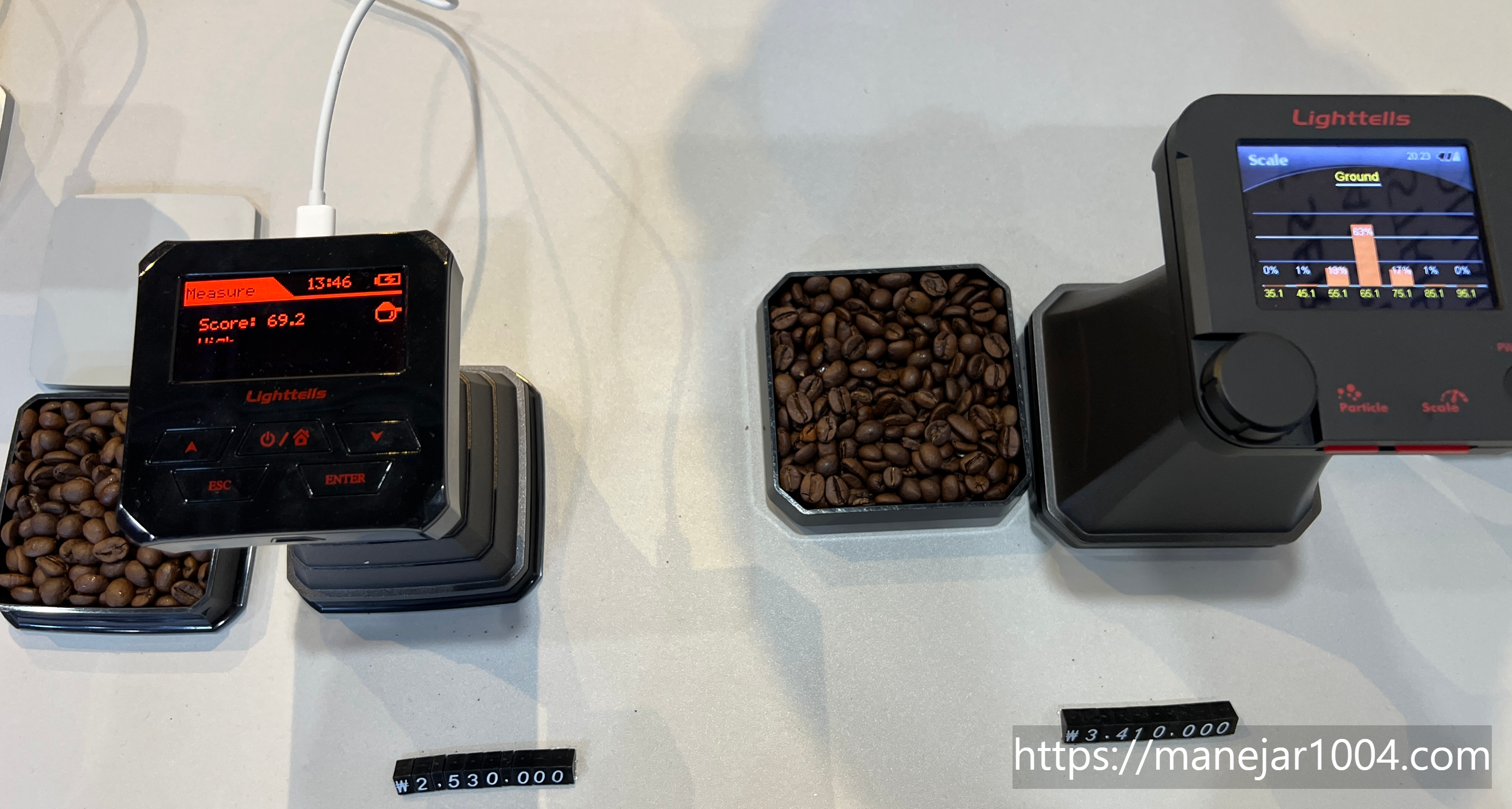 - LIGHTTELSS 사 신제품으로 로스팅 된 커피 컬러 및 입도(분쇄도) 분석을 할 수 있고 로스트 컬러 측정값뿐만 아니라 각각 컬러별 비율을 그래프를 통해 쉽게 볼 수 있습니다. 입도 분석 또한 각각 입자 크기별 그래프를 통해 볼 수 있습니다.
