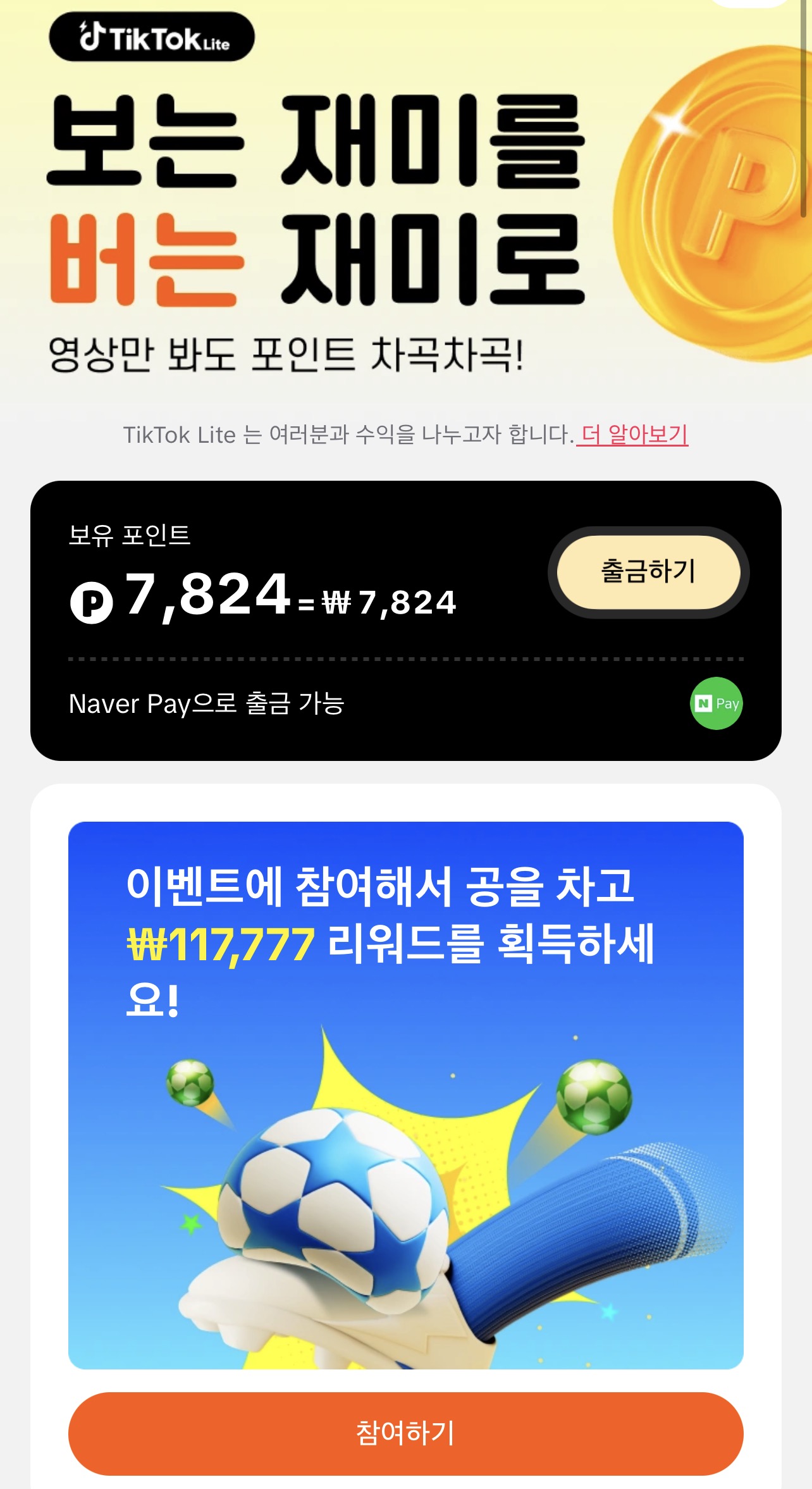 사촌의 카톡."누나, 빨리 공 차! 10만원 벌어!" 이건 뭔 신박한 영업(?)인가했더니 바로 틱톡라이트 "공차기"였다.쇼츠나 광고속에서 많이 보는 틱톡광고. 직접 해본적이 없어서 진짜 준다(?)는 말