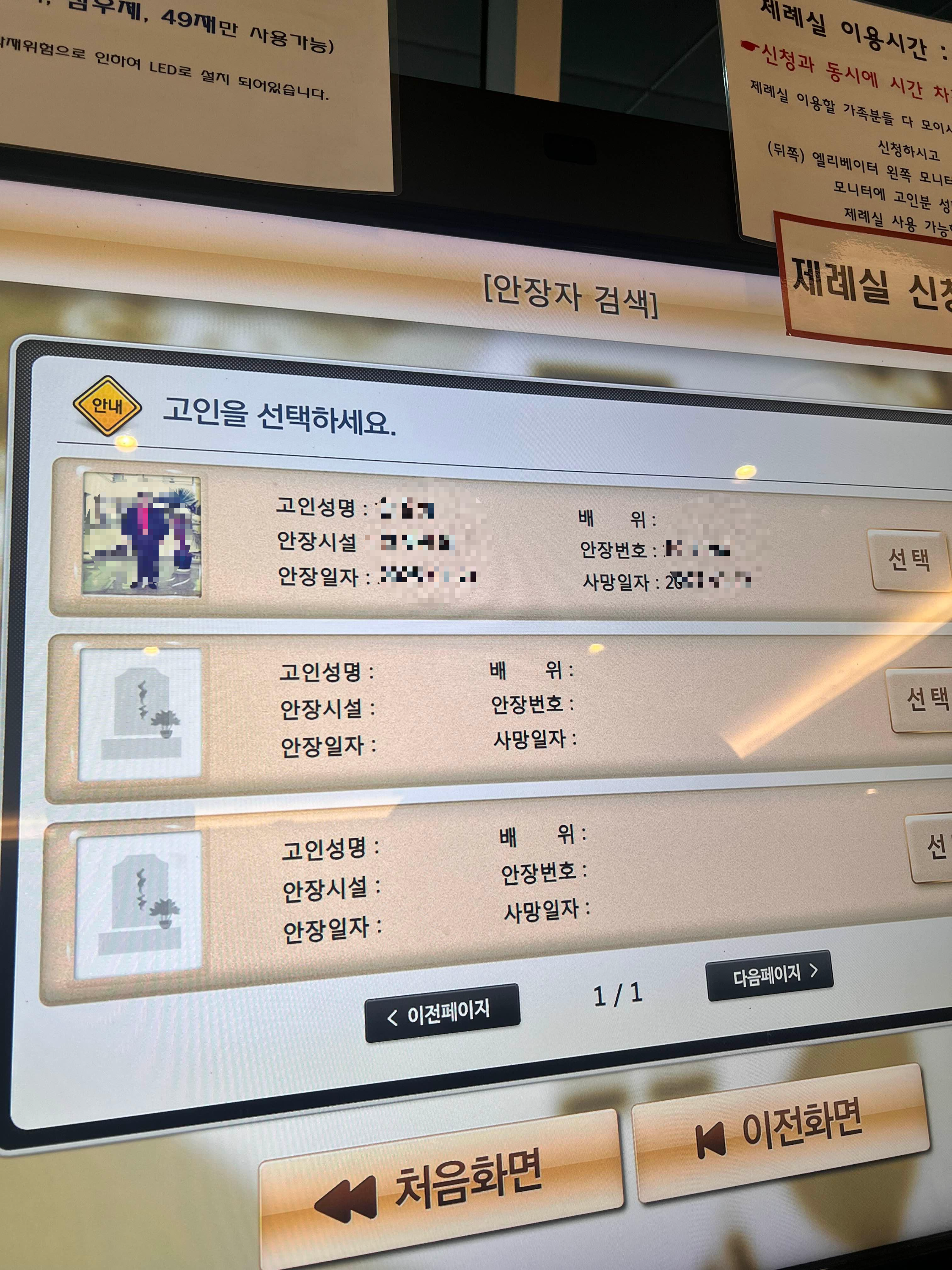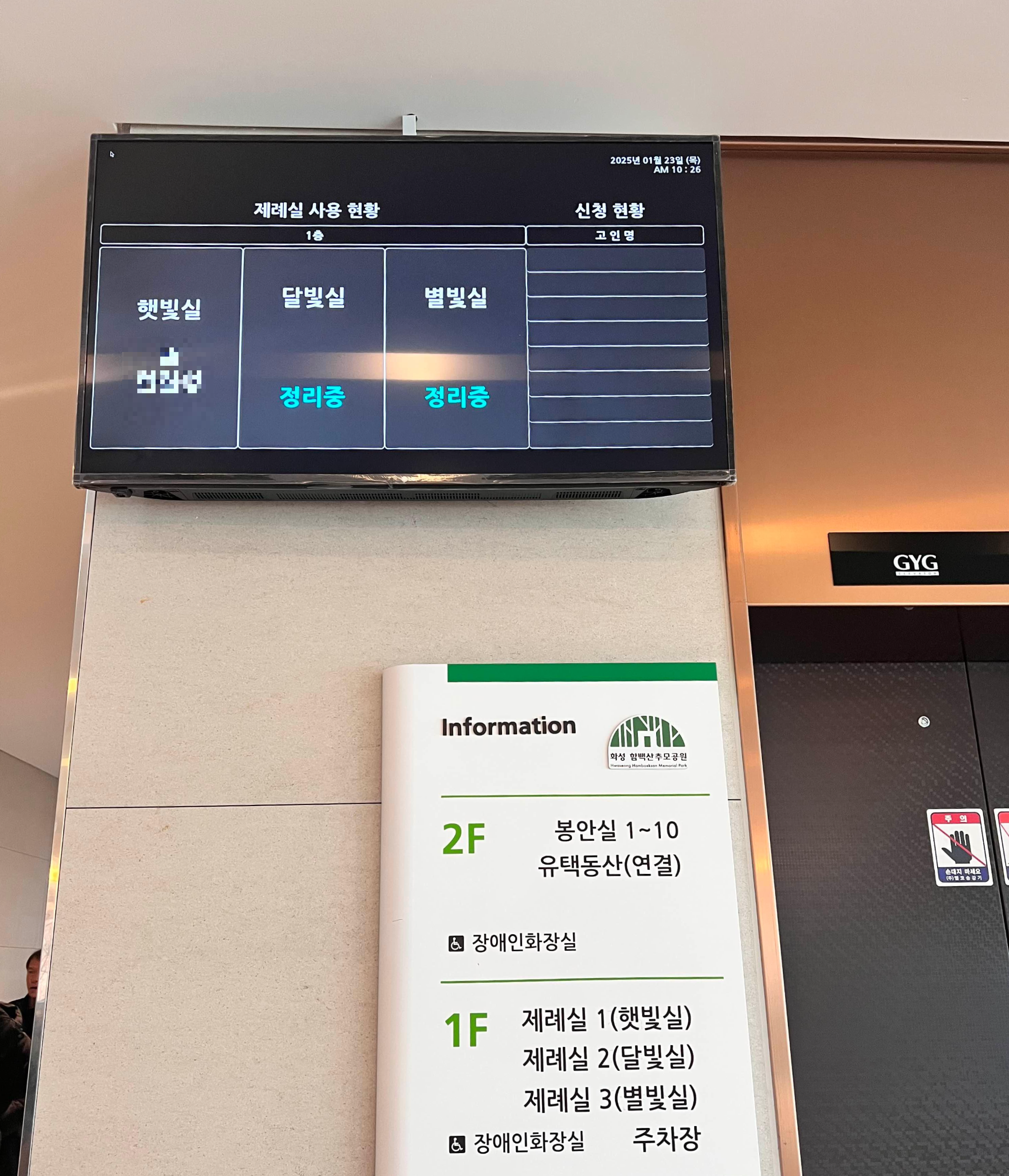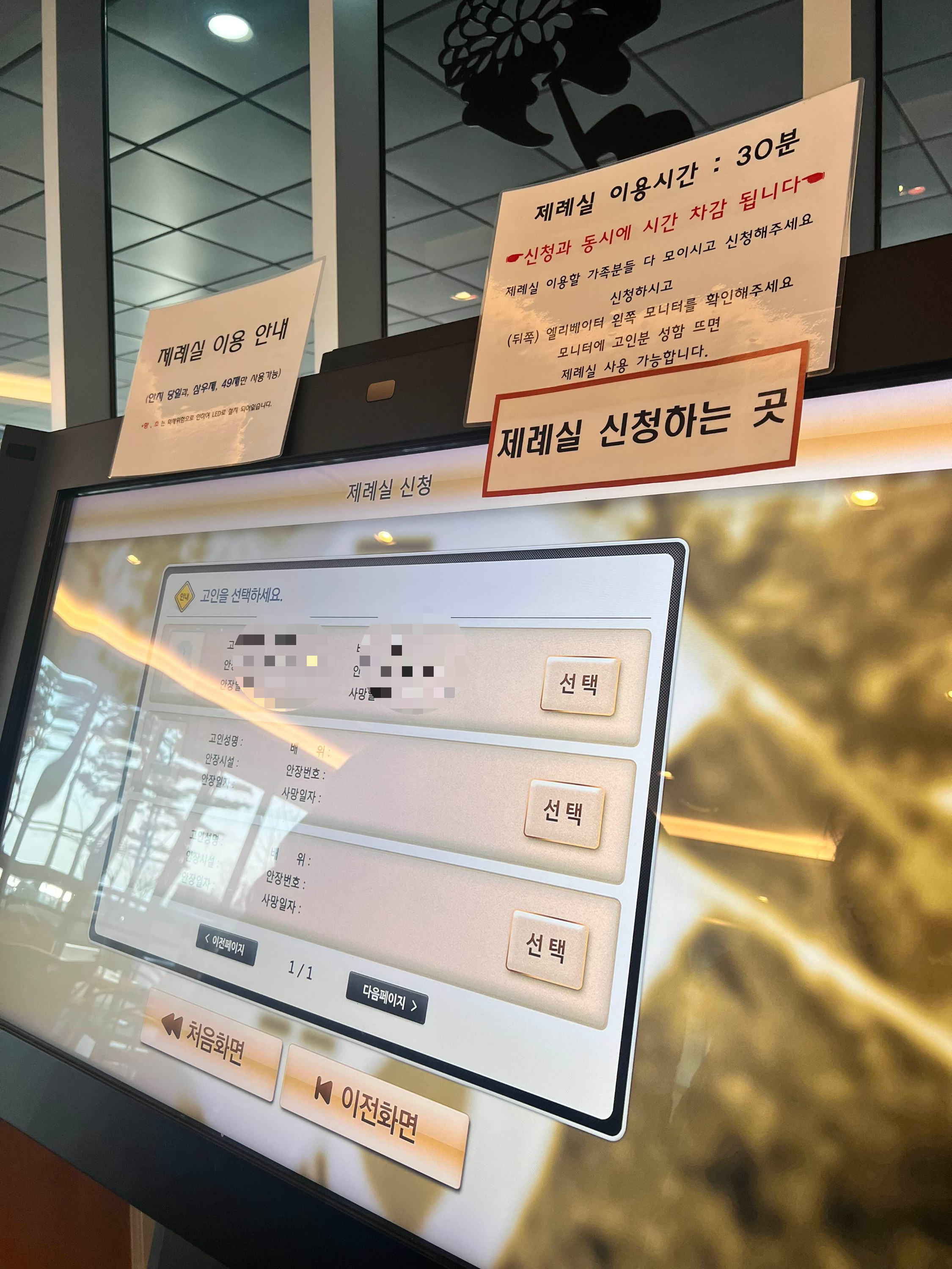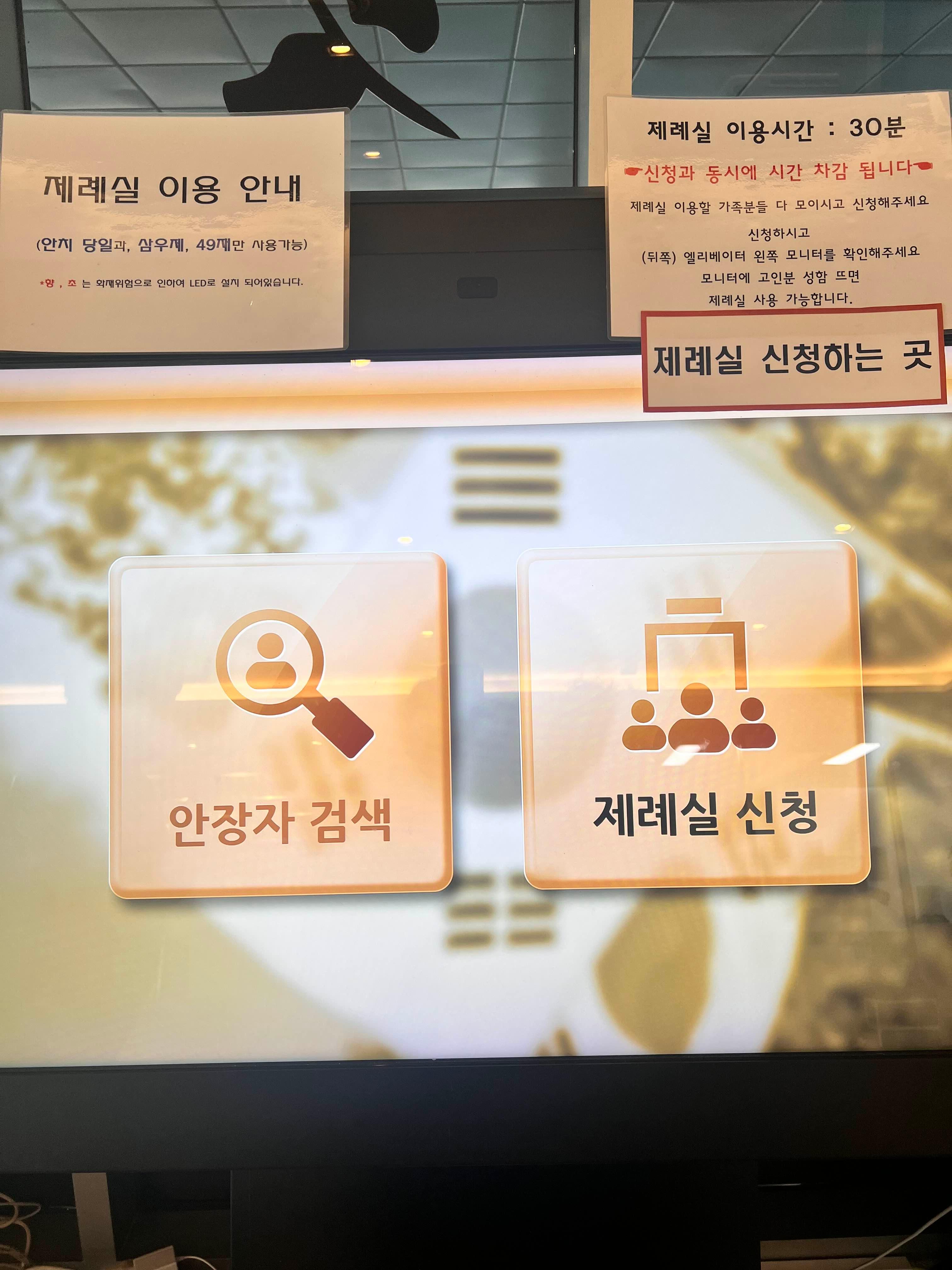 ④ 엘레베이터 왼쪽 모니터에 신청한 고인분 성함 뜨면 제례실 사용가능
