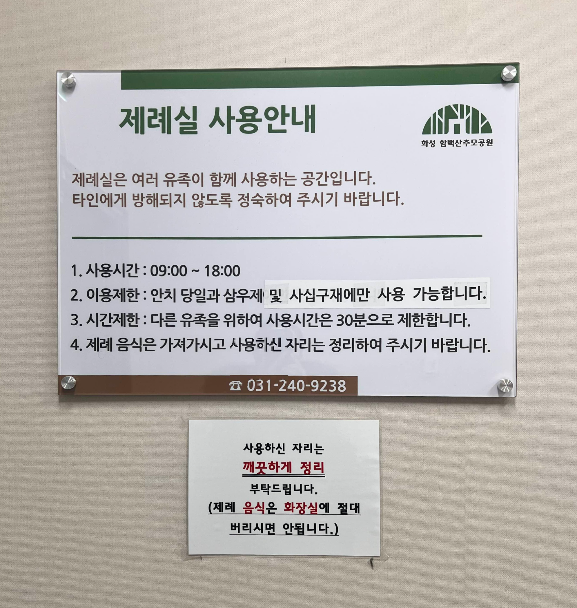 제례실 이용할 때 모든 가족이 모인 후 신청해야합니다. 추가시간 없습니다. 명절과 기제사는 제례실을 이이용할 수 없습니다. 제례실 신청은 예약제가 아니라 봉안당 1층 키오스크에서 직접 신청해야합니다.