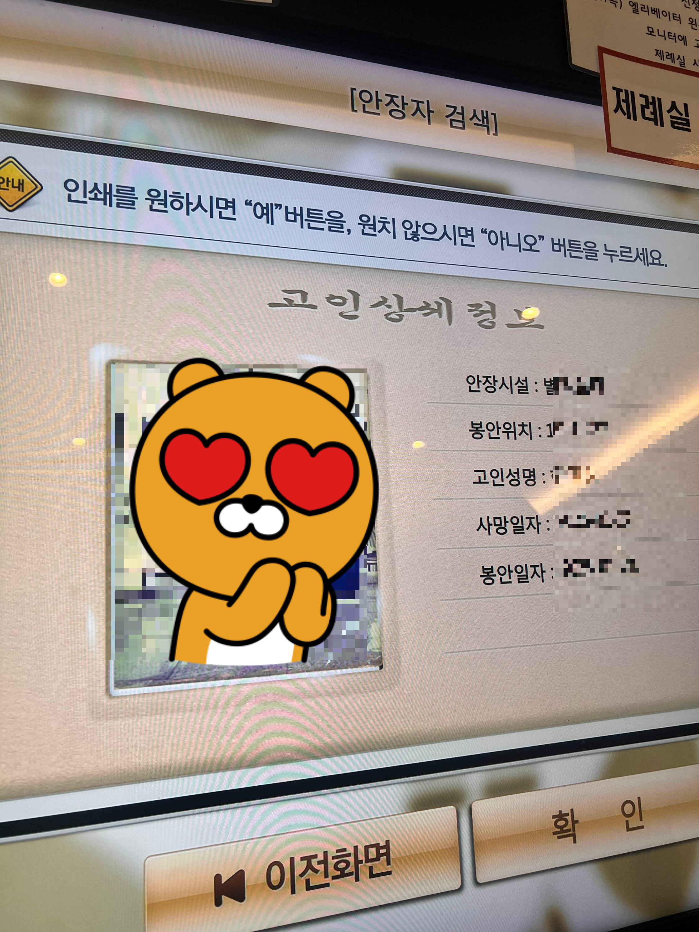 모니터에서 고인의 이름이 위패에 송출이 됩니다.