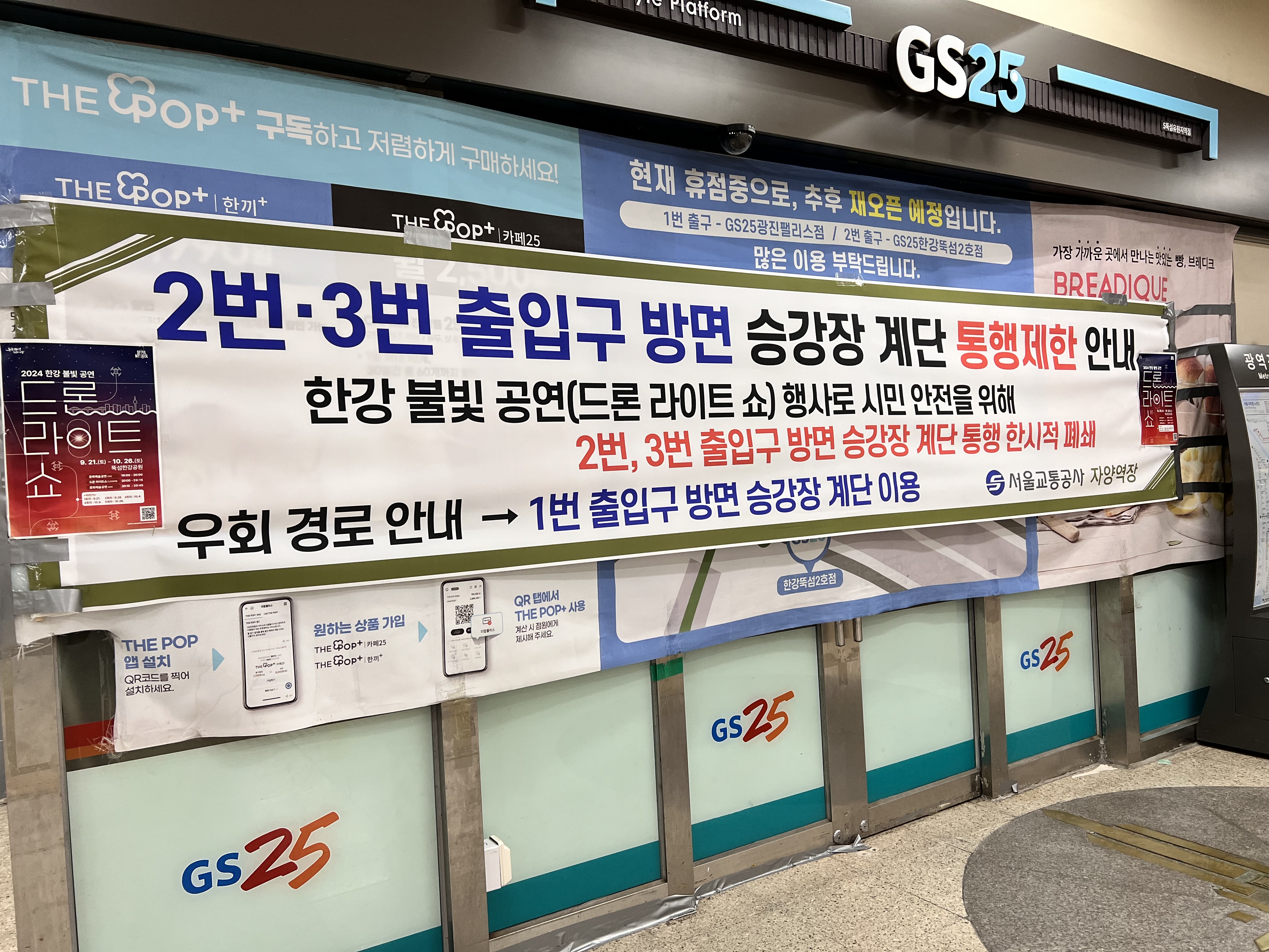 자양역에서 내려서 우회해서 공연장으로 가야합니다.  2,3번 출입구 계단통행은 일시적 통제를 한다고 해요.  1번 출입구 방면을 통해서 뚝섬한강공원으로 가시면 됩니다.