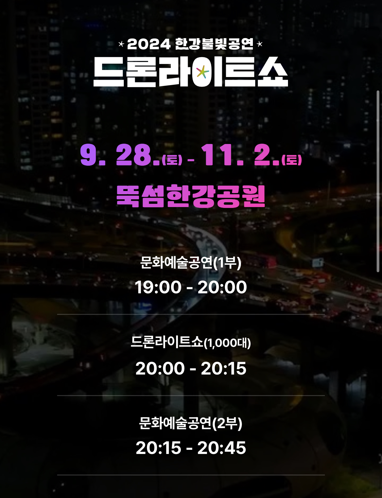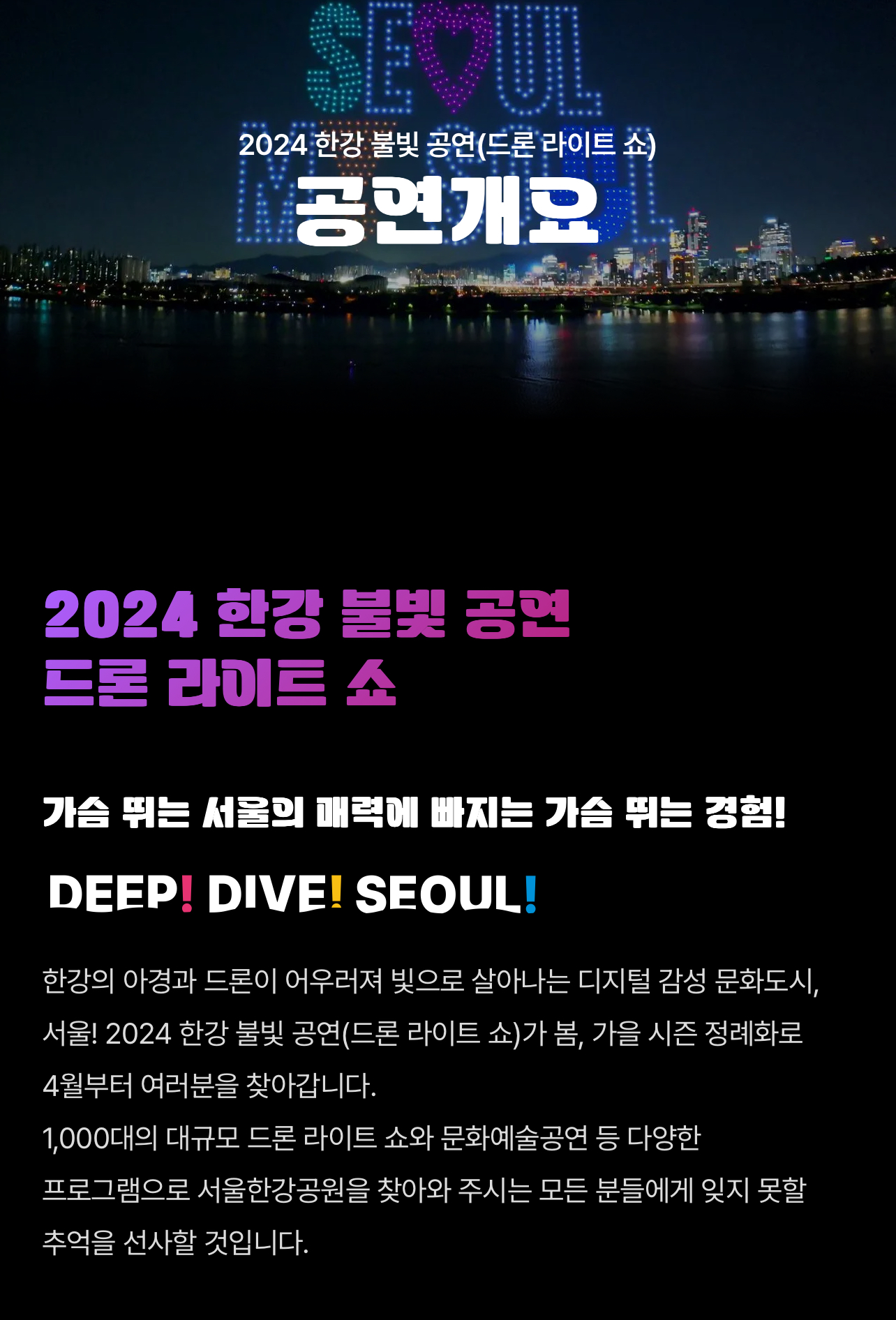 2024한강불빛공연 하반기가 곧 시작됩니다. 1,000개의 드론이 가을밤 서울 한강공원을 화려하게 수놓는 행사는 대표적인 야경행사입니다.