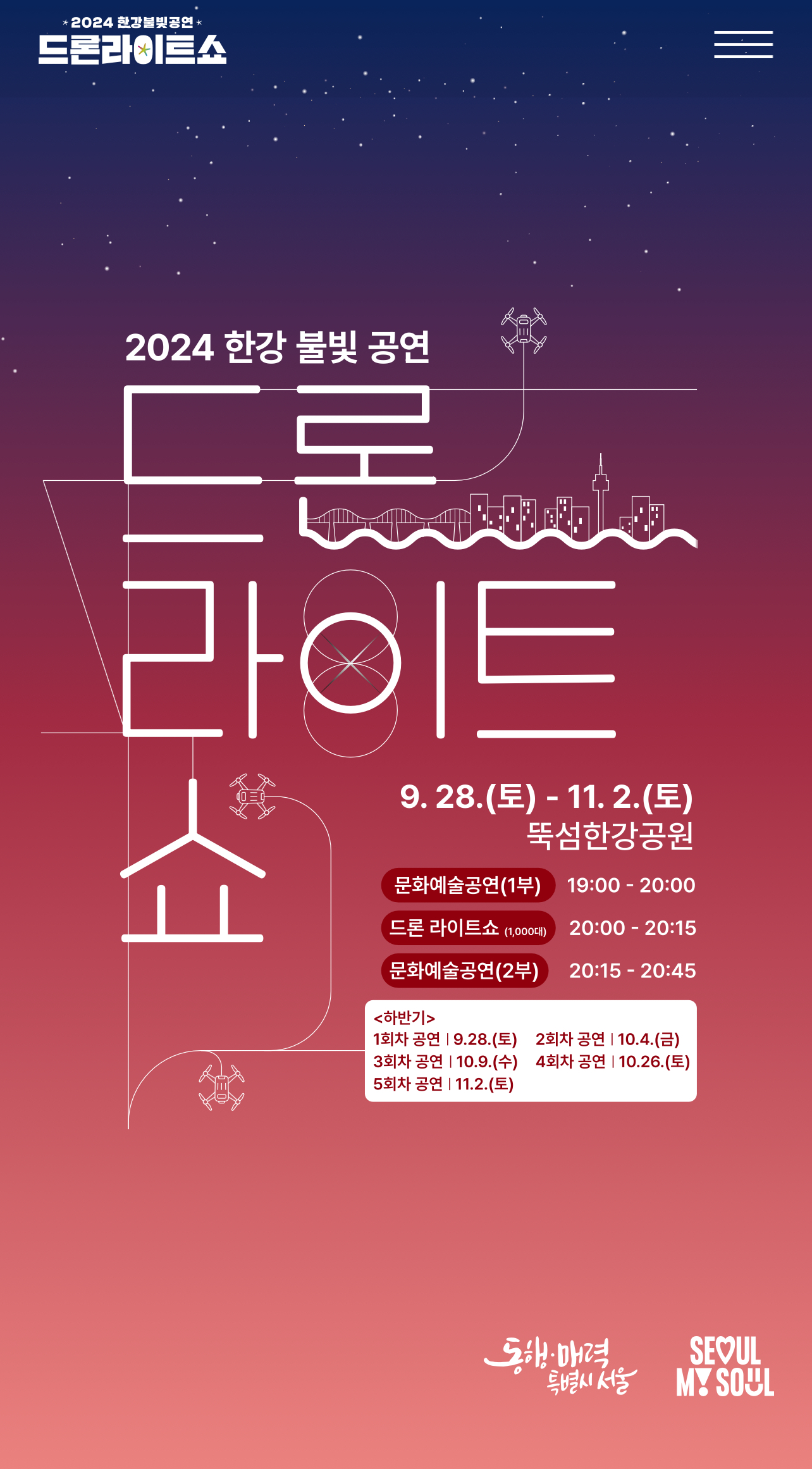 2024년 하반기 드론 라이트쇼는 9월 28일부터 11월 2일까지 뚝섬한강공원에서 총 5회 공연합니다. 저녁 8시부터 약 15분간 펼쳐집니다. 총 5회의 공연이 준비되어 있으며, 각 공연마다 독특한 주제가 선정되어 있습니다. 한강의 밤하늘을 채우는 드론 쇼는 단순히 빛을 보여주는 것을 넘어, 음악과 스토리를 결합한 테마로 매 공연마다 다른 경험을 선사합니다