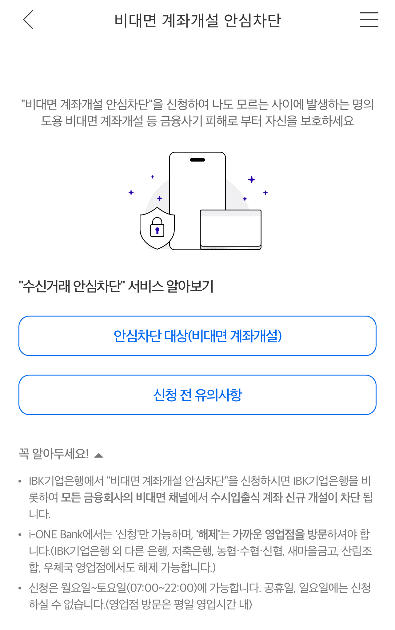 - 비대면 계좌개설 안심차단 신청도 함께 하세요.